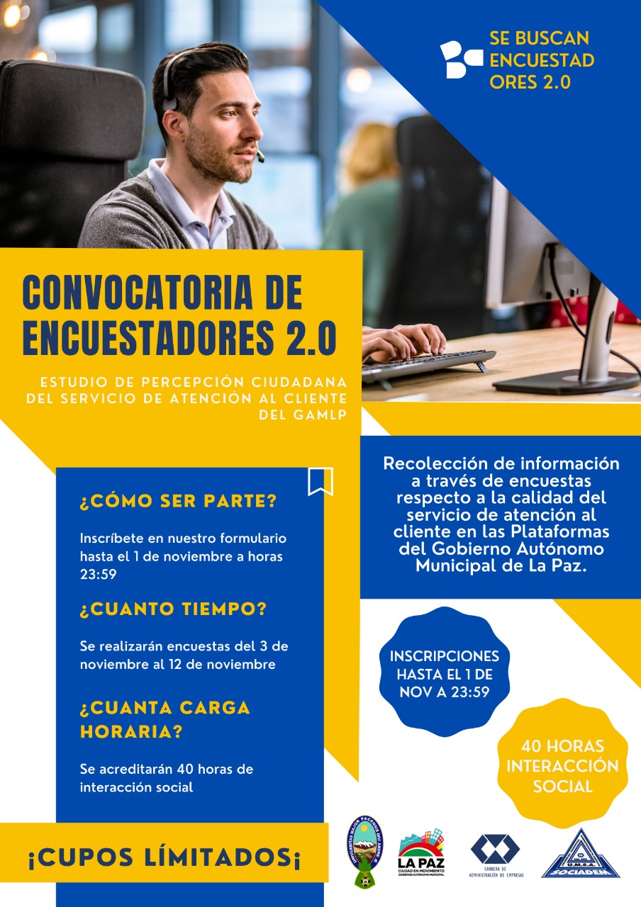 Esta es tu oportunidad, se necesita realizar encuestas en los diferentes puntos de la ciudad de La Paz, en las Plataformas de atención al cliente del Gobierno Autónomo Municipal de La Paz.