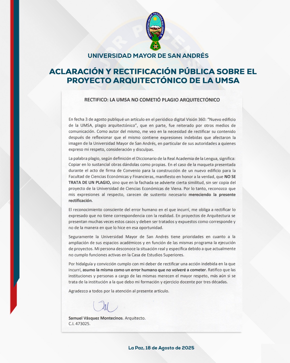 La Universidad Mayor de San Andrés comunica a la sociedad que el arquitecto Samuel Vásquez Montecinos ha presentado una carta de rectificación y aclaración pública respecto a las declaraciones difundidas en diversos medios digitales, periódicos, canales y redes sociales sobre un supuesto plagio arquitectónico en nuestro nuevo edificio.