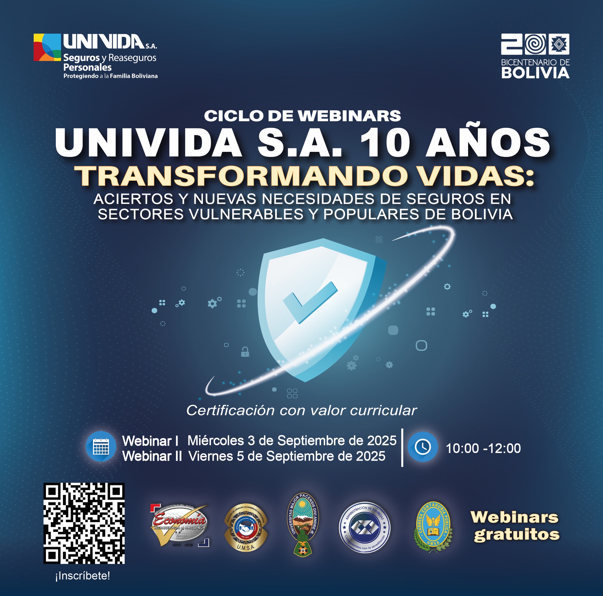 Súmate al Ciclo de Webinars gratuitos de UNIVIDA S.A. y potencia tu formación con reconocidos ponentes nacionales e internacionales que abordarán el tema de:❞𝑼𝑵𝑰𝑽𝑰𝑫𝑨 𝑺.𝑨. 10 𝑨𝑵̃𝑶𝑺 𝑻𝑹𝑨𝑵𝑺𝑭𝑶𝑹𝑴𝑨𝑵𝑫𝑶 𝑽𝑰𝑫𝑨𝑺: 𝑨𝒄𝒊𝒆𝒓𝒕𝒐𝒔 𝒚 𝒏𝒖𝒆𝒗𝒂𝒔 𝒏𝒆𝒄𝒆𝒔𝒊𝒅𝒂𝒅𝒆𝒔 𝒅𝒆 𝒔𝒆𝒈𝒖𝒓𝒐𝒔 𝒆𝒏 𝒔𝒆𝒄𝒕𝒐𝒓𝒆𝒔 𝒗𝒖𝒍𝒏𝒆𝒓𝒂𝒃𝒍𝒆𝒔 𝒚 𝒑𝒐𝒑𝒖𝒍𝒂𝒓𝒆𝒔 𝒅𝒆 𝑩𝒐𝒍𝒊𝒗𝒊𝒂❞ junto a la UMSA – Facultad de Ciencias Económicas Financieras de la Universidad Mayor de San Andrés – UMSA