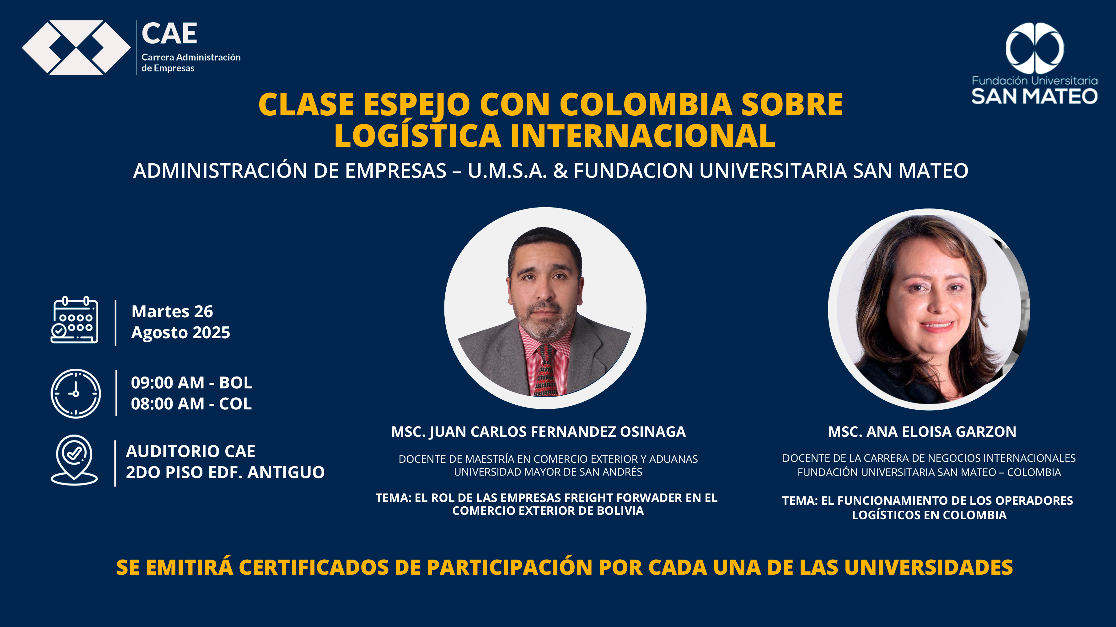 Docente de Maestría en Comercio Exterior y AduanasUniversidad Mayor de San AndrésTema: El rol de las empresas Freight Forwader en el comercio exterior de Bolivia*Dia: Martes 26 de agosto 2025**Hora: 08:00 a.m. Colombia – 09:00 a.m. hora de Bolivia*