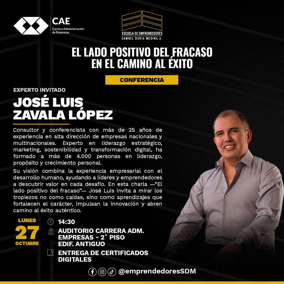 La Escuela de Emprendedores Samuel Doria Medina A. junto a la Carrera de Administración de Empresas – UMSA te invitan a participar de una charla motivadora con el experto internacional José Luis Zavala López, consultor con más de 25 años de experiencia en liderazgo, transformación digital y desarrollo personal.