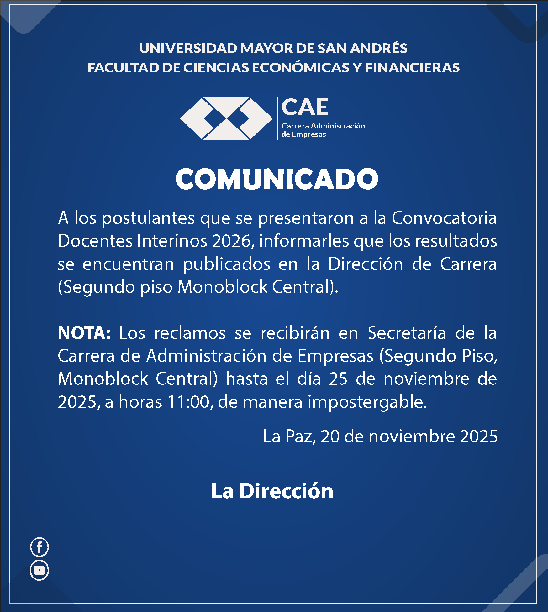 Navegación de entradas SORTEO DE BOLOS – EXAMEN DE GRADO 20 DE NOVIEMBRE DEL 2025 *ÁREA: ADMINISTRATIVA GERENCIAL CONVOCATORIA N° 001 /2025 *CONCURSO DE MÉRITOS PARA DOCENTE(S) INVESTIGADOR(ES)INTERINO(S)