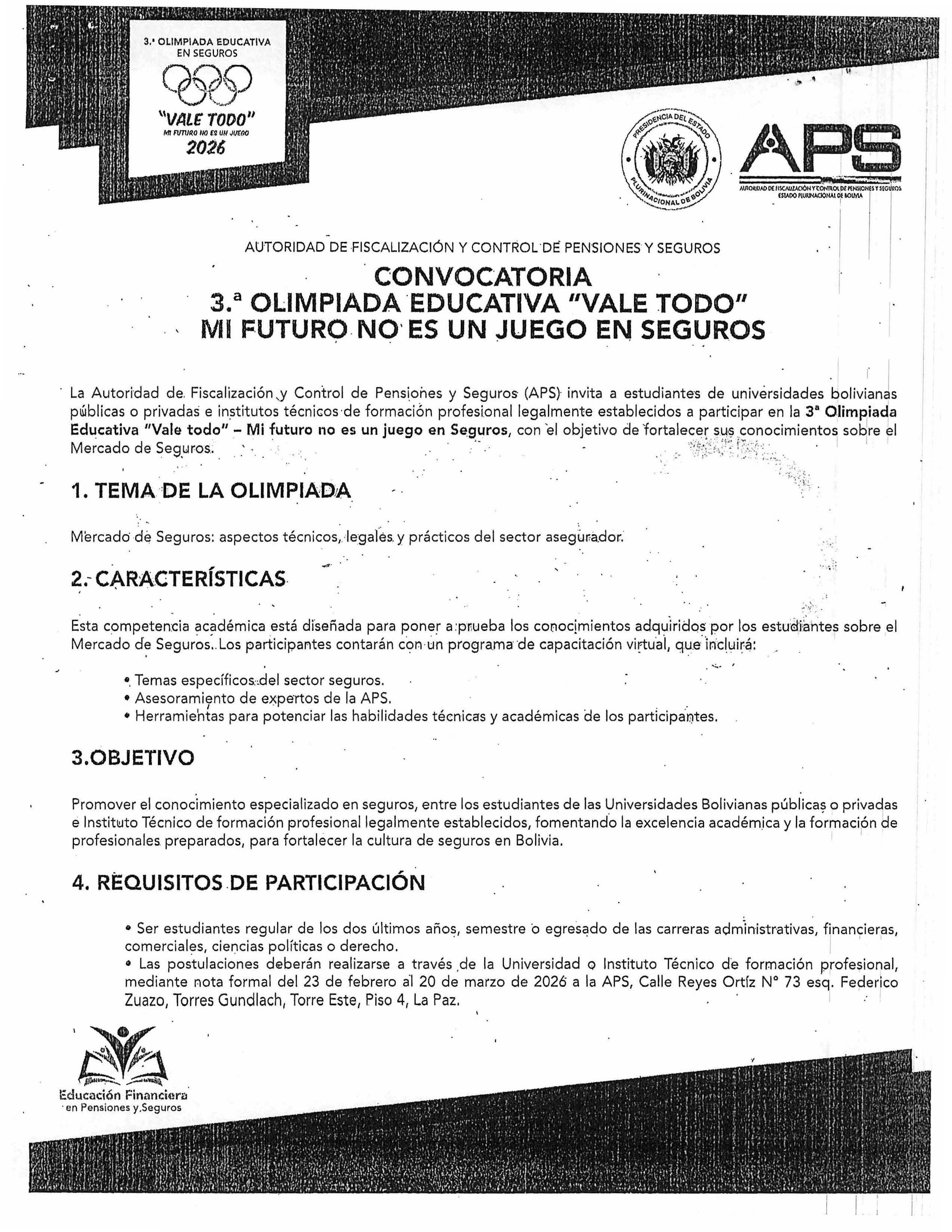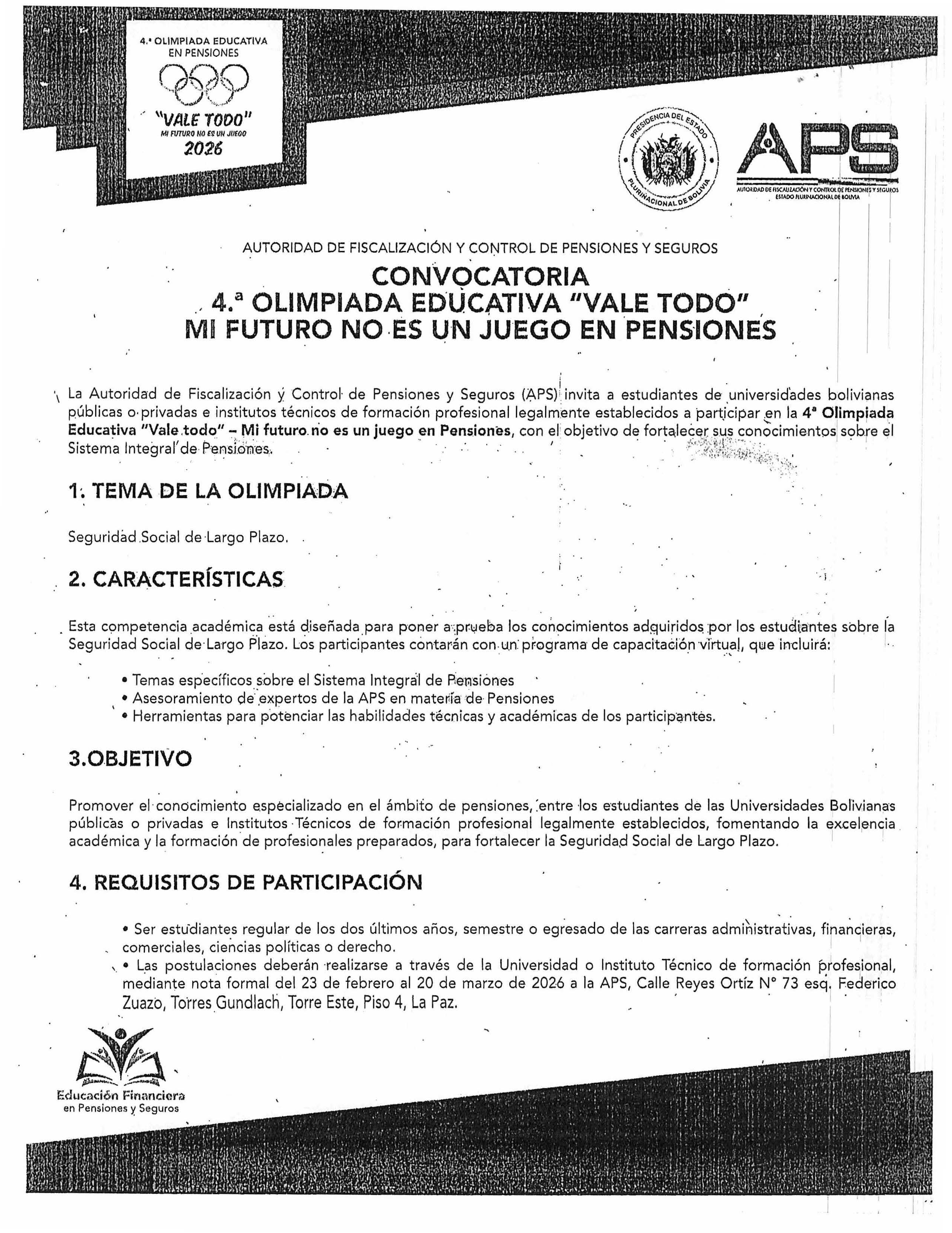 La Dirección de la Carrera de Administración de Empresas, en compromiso con la formación integral y financiera de sus estudiantes, invita a toda la comunidad estudiantil a participar en las próximas olimpiadas educativas de la AUTORIDAD DE FISCALIZACIÓN Y CONTROL DE PENSIONES Y SEGUROS APS: