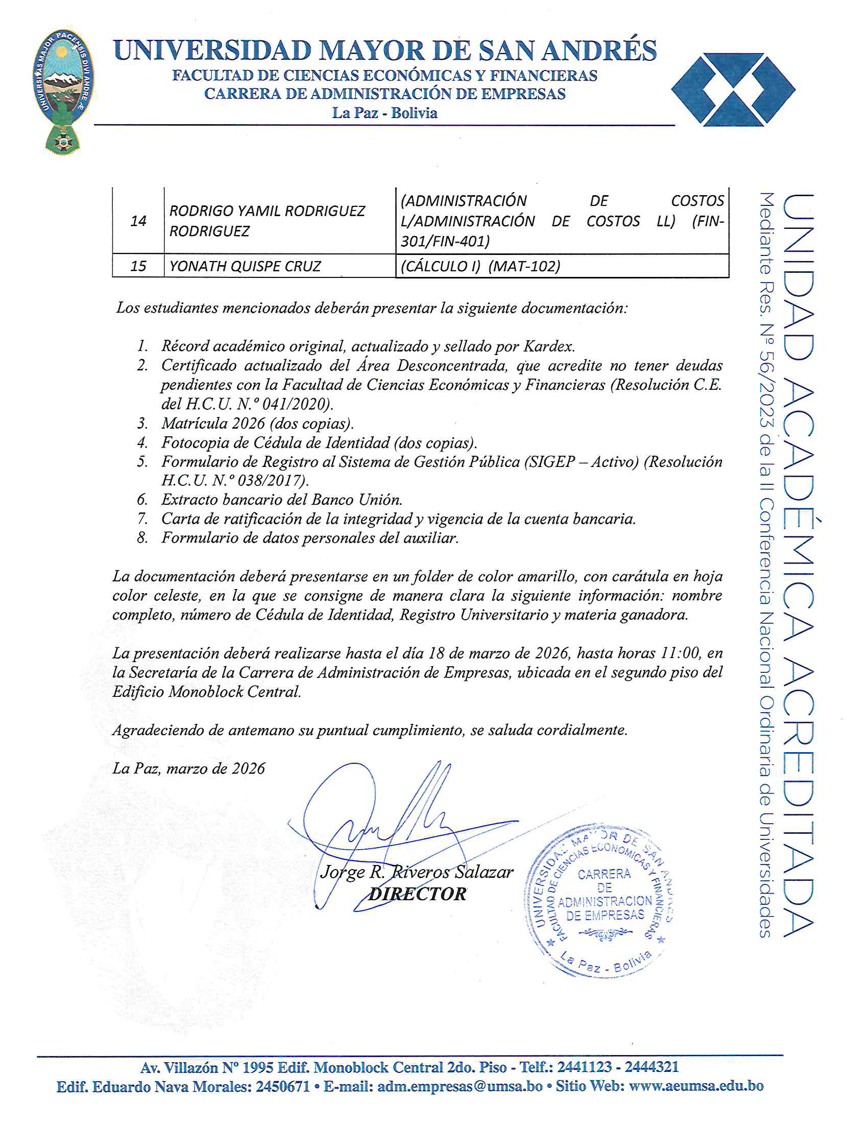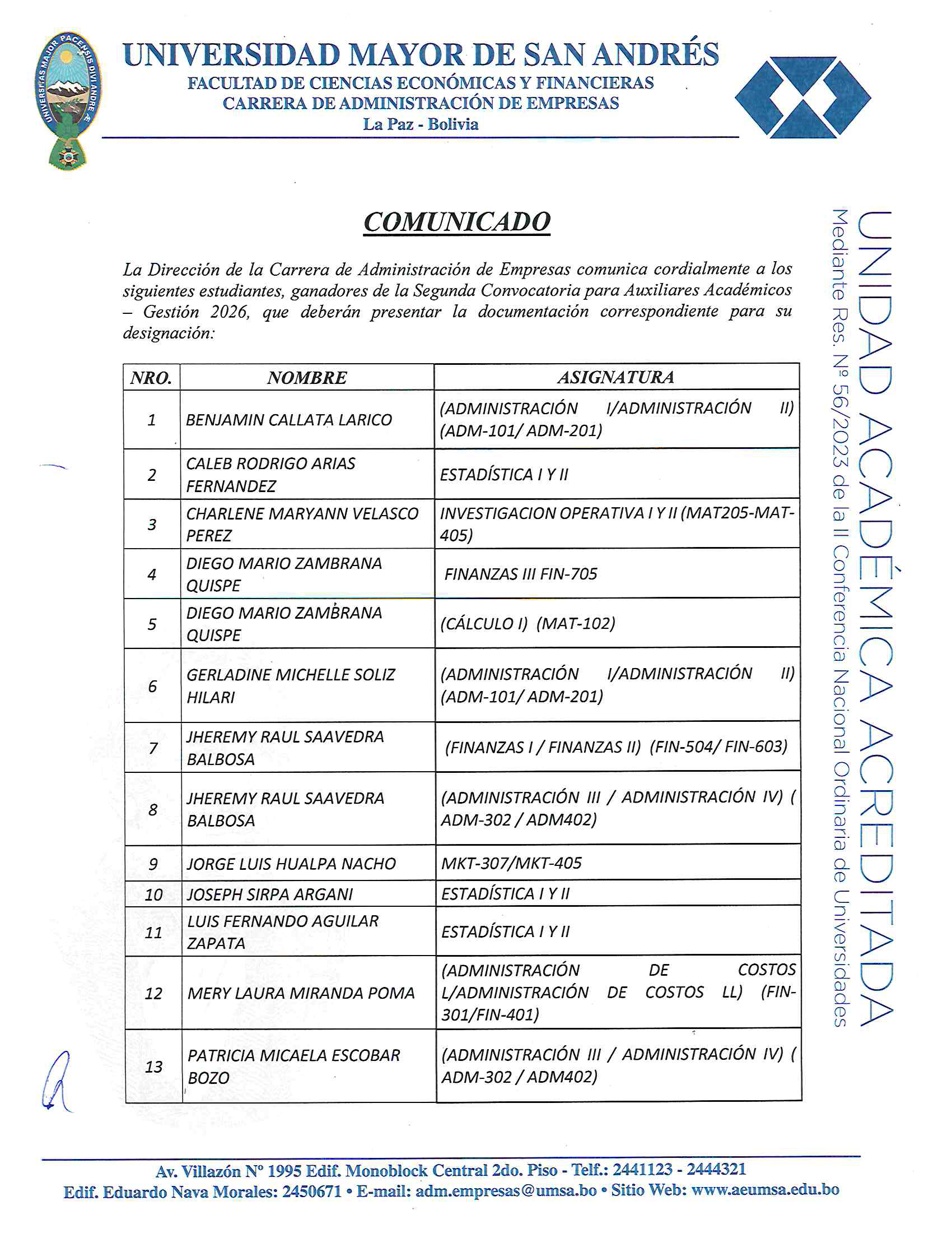 COMUNICADO SEGUNDA CONVOCATORIA PARA AUXILIARES ACADÉMICOS- GESTIÓN 2026