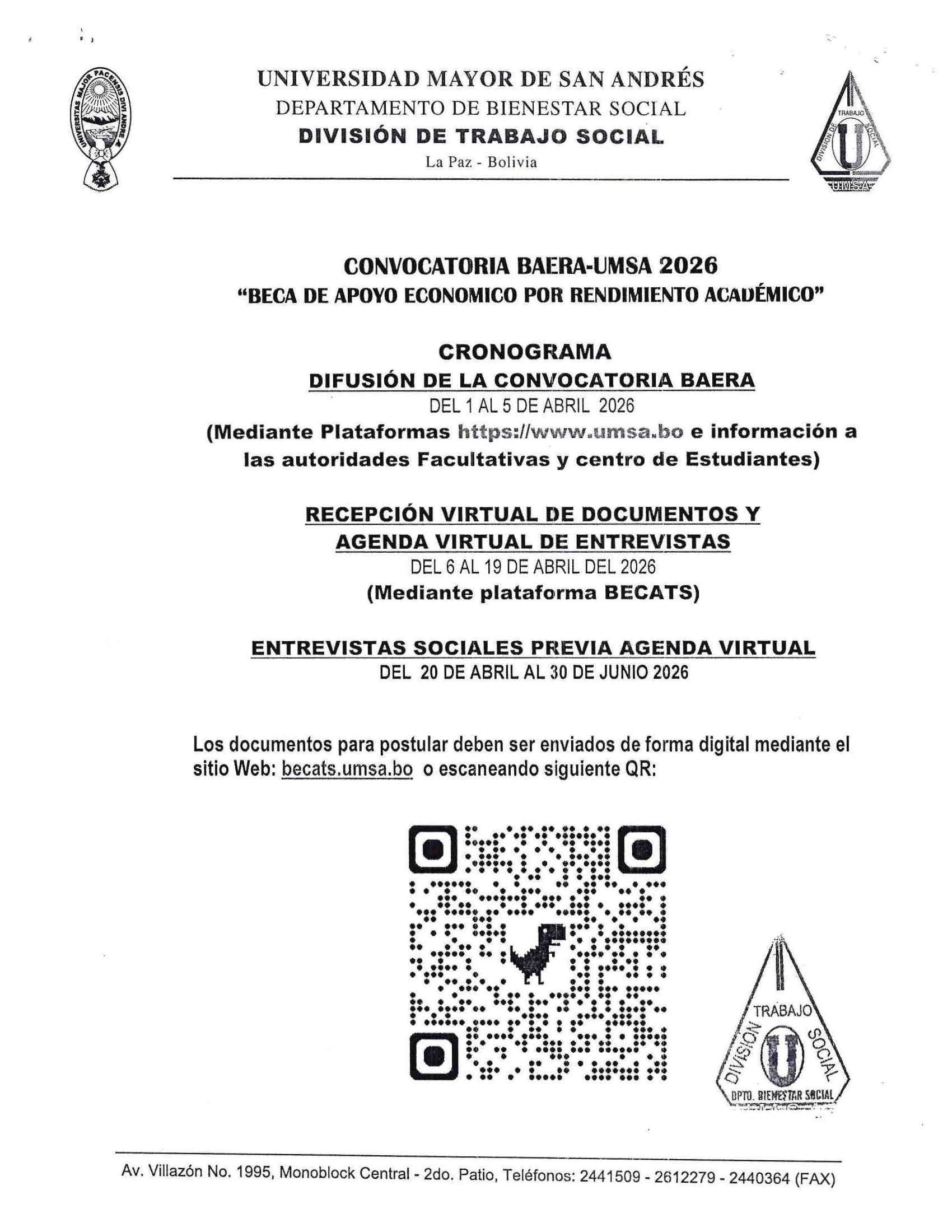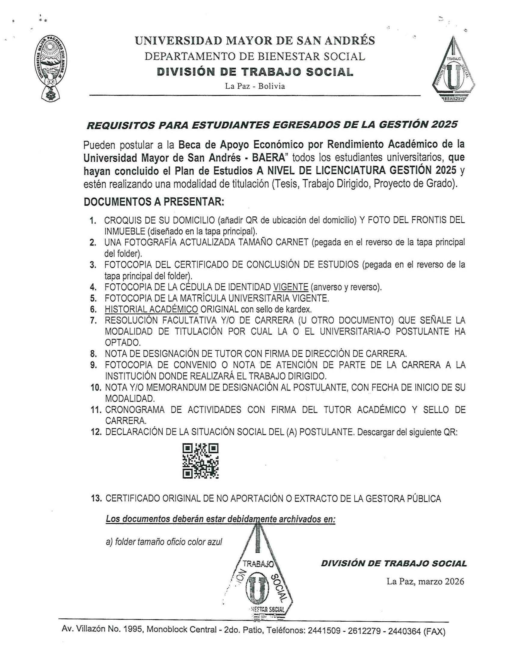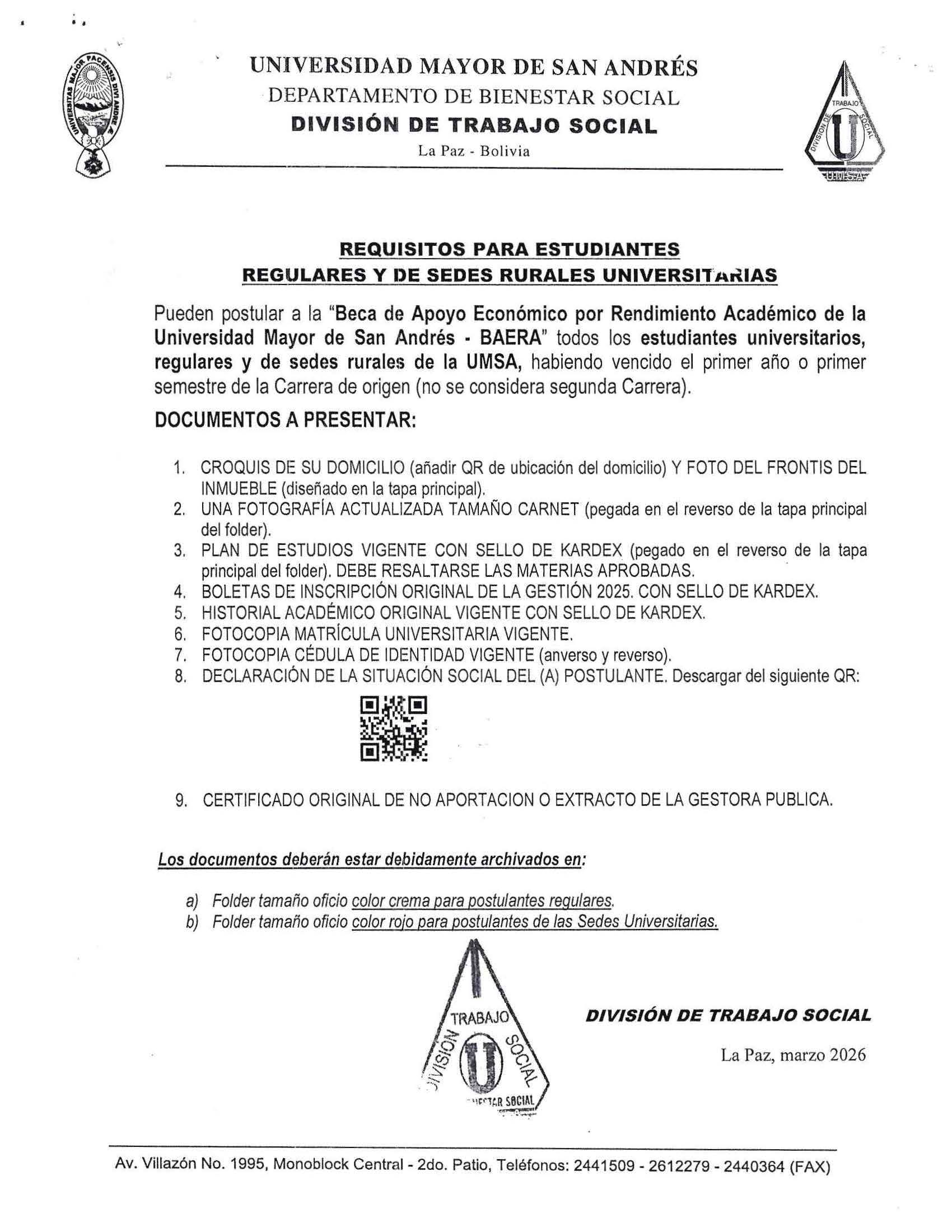 CONVOCATORIA PROGRAMA “BAERA” * “BECA DE APOYO ECONÓMICO POR RENDIMIENTO ACADÉMICO DE LA UMSA” – GESTIÓN 2026, REQUISITOS PARA ESTUDIANTES EGRESADOS DE LA GESTIÓN 2025, REQUISITOS PARA ESTUDIANTES REGULARES Y DE SEDES RURALES UNIVERSITARIAS