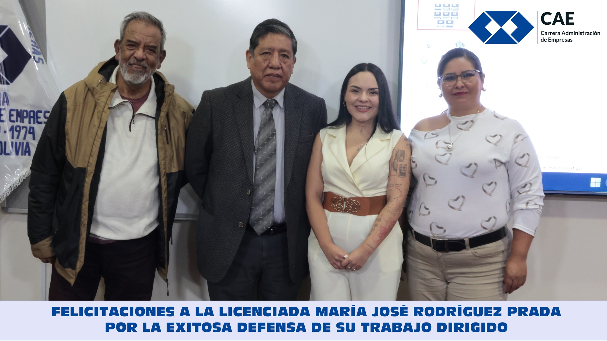 La Carrera felicita a María José Rodríguez Prada por la exitosa defensa de su Trabajo Dirigido, cumpliendo así con los requisitos académicos para la obtención del título de Licenciada. Le auguramos el mayor de los éxitos en su futuro profesional
