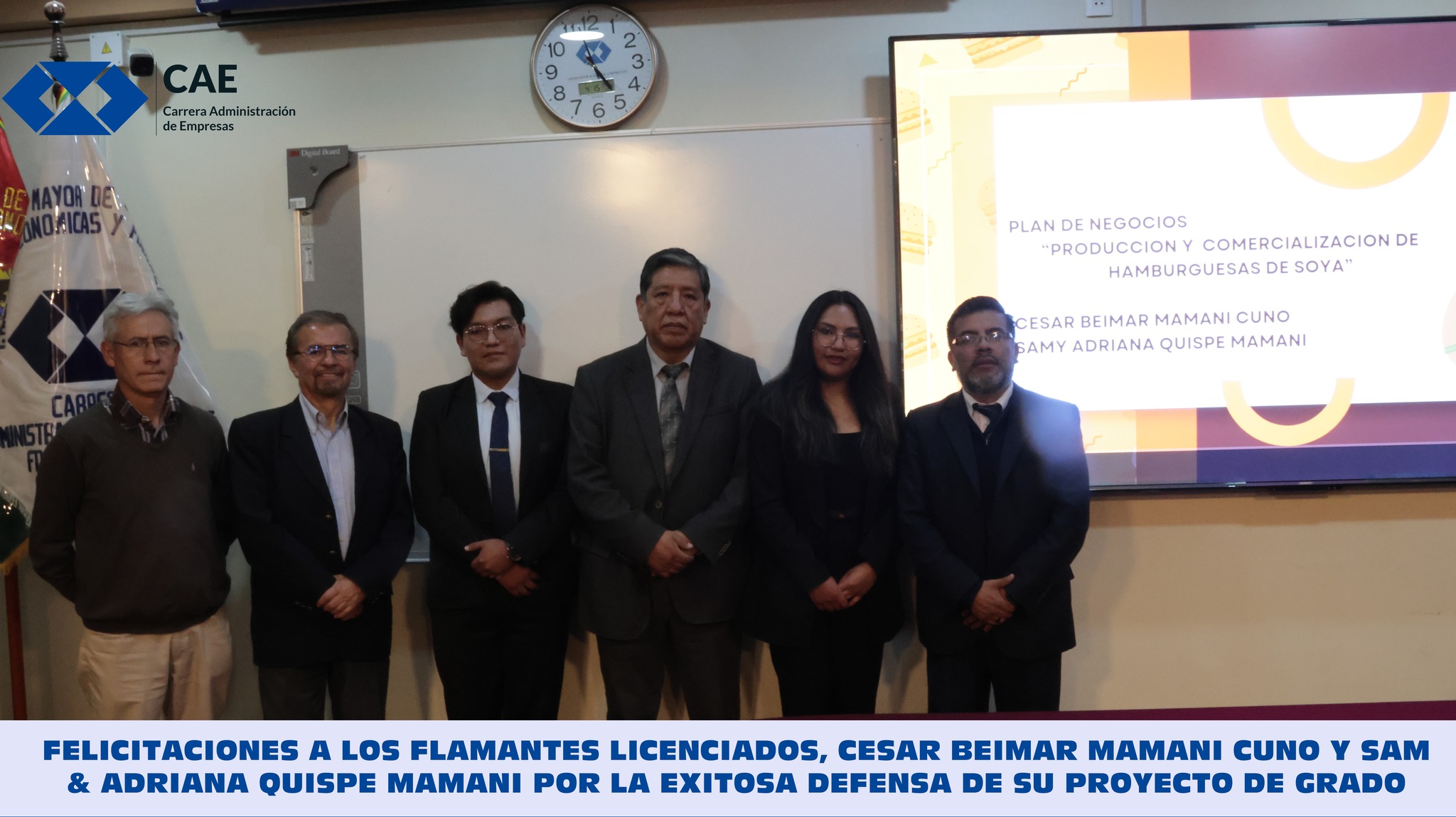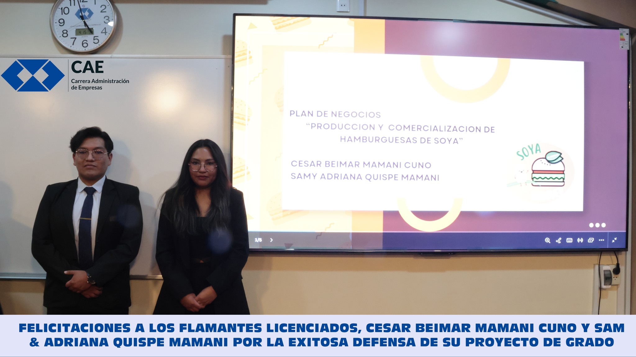 FELICITACIONES A LOS FLAMANTES LICENCIADOS CESAR BEIMAR MAMANI CUNO Y SAMY ADRIANA QUISPE MAMANI POR LA EXITOSA DEFENSA DE SU PROYECTO DE GRADO “SOYA BURGUER”