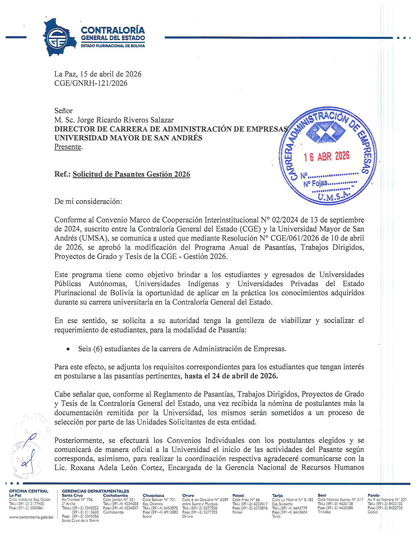 Navegación de entradas SOLICITUD DE PASANTES PARA EL MINISTERIO DE DESARROLLO PRODUCTIVO RURAL AGUA FELICITACIONES DEFENSA DE SU PROYECTO DE GRADO