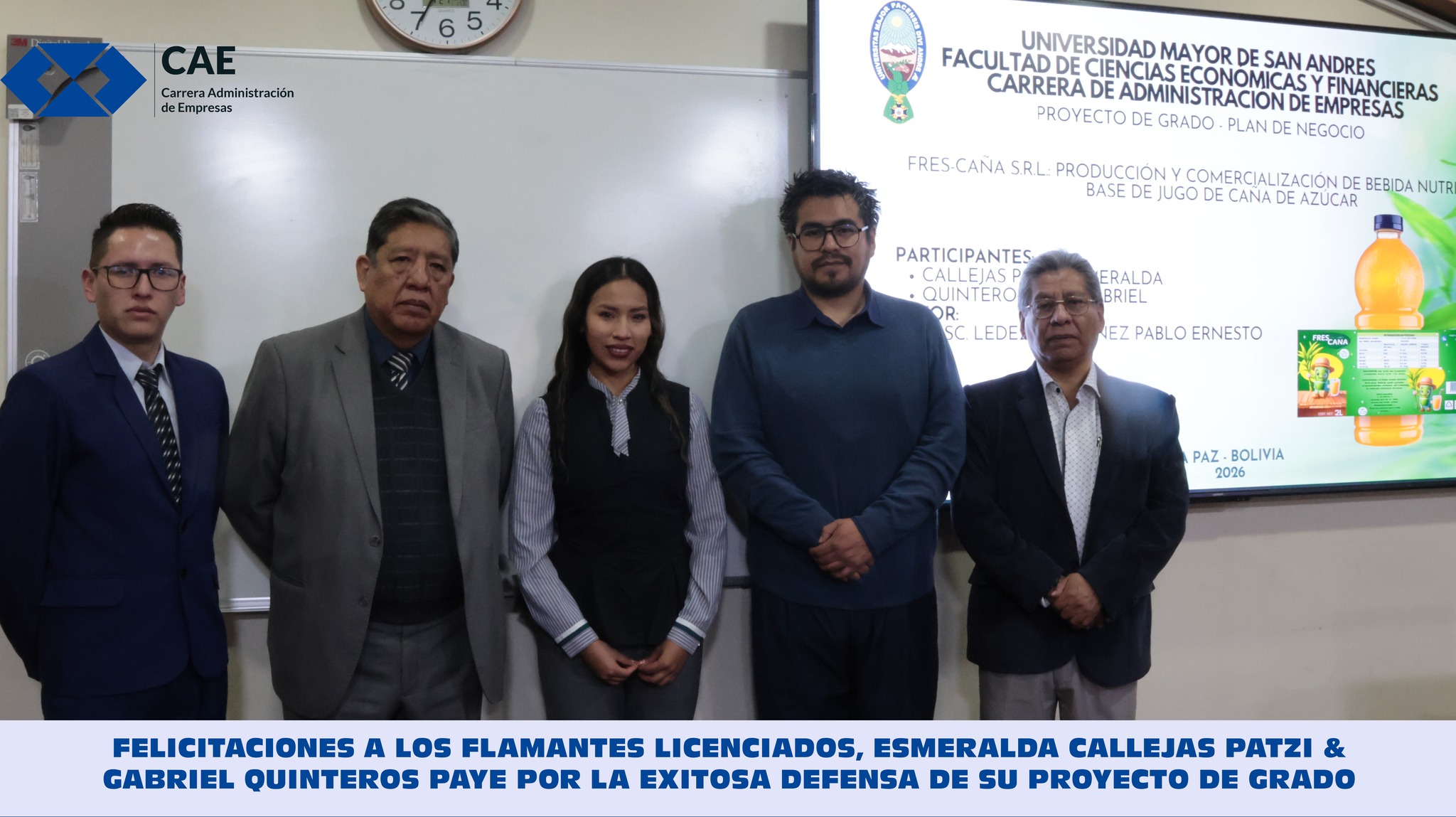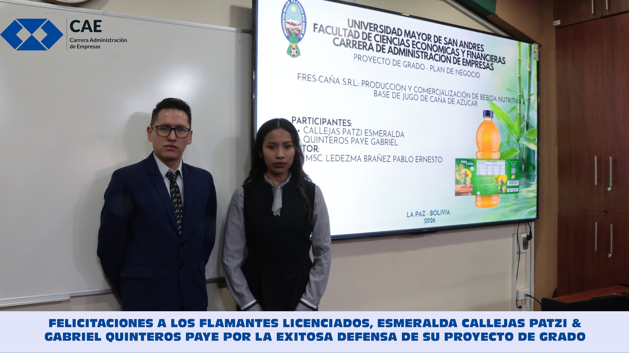 FELICITACIONES A LOS FLAMANTES LICENCIADOS, ESMERALDA CALLEJAS PATZI & GABRIEL QUINTEROS PAYE POR LA EXITOSA DEFENSA DE SU PROYECTO DE GRADO