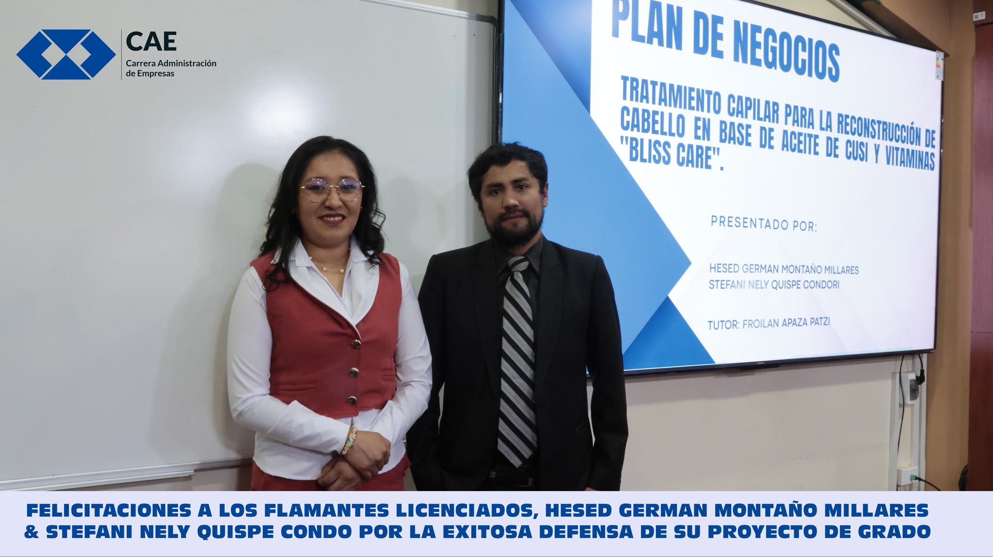 FELICITACIONES A LOS FLAMANTES LICENCIADOS, HESED GERMAN MONTAÑO MILLARES & STEFANI NELY QUISPE CONDO POR LA EXITOSA DEFENSA DE SU PROYECTO DE GRADO