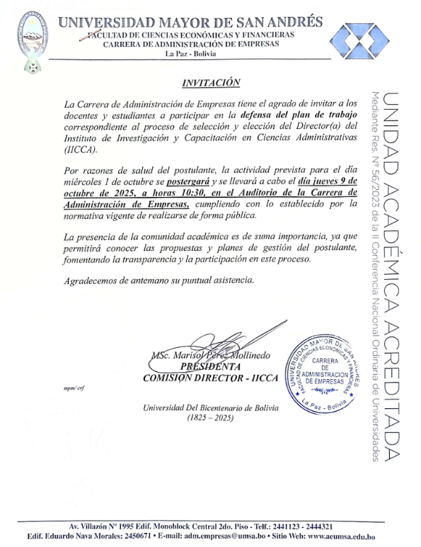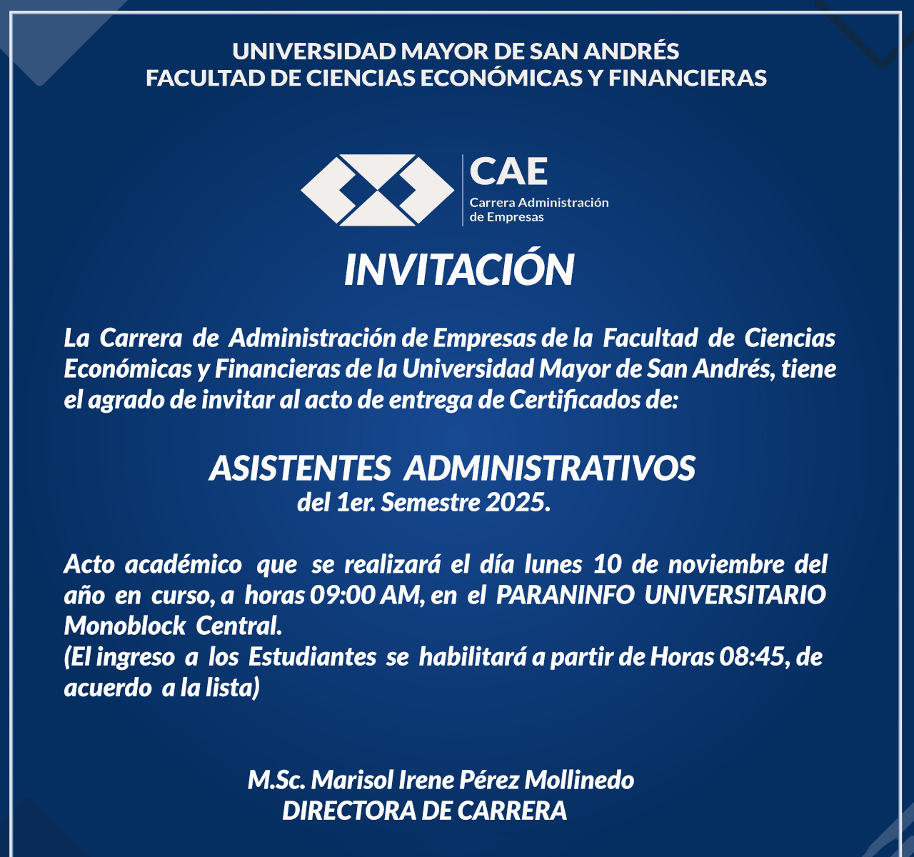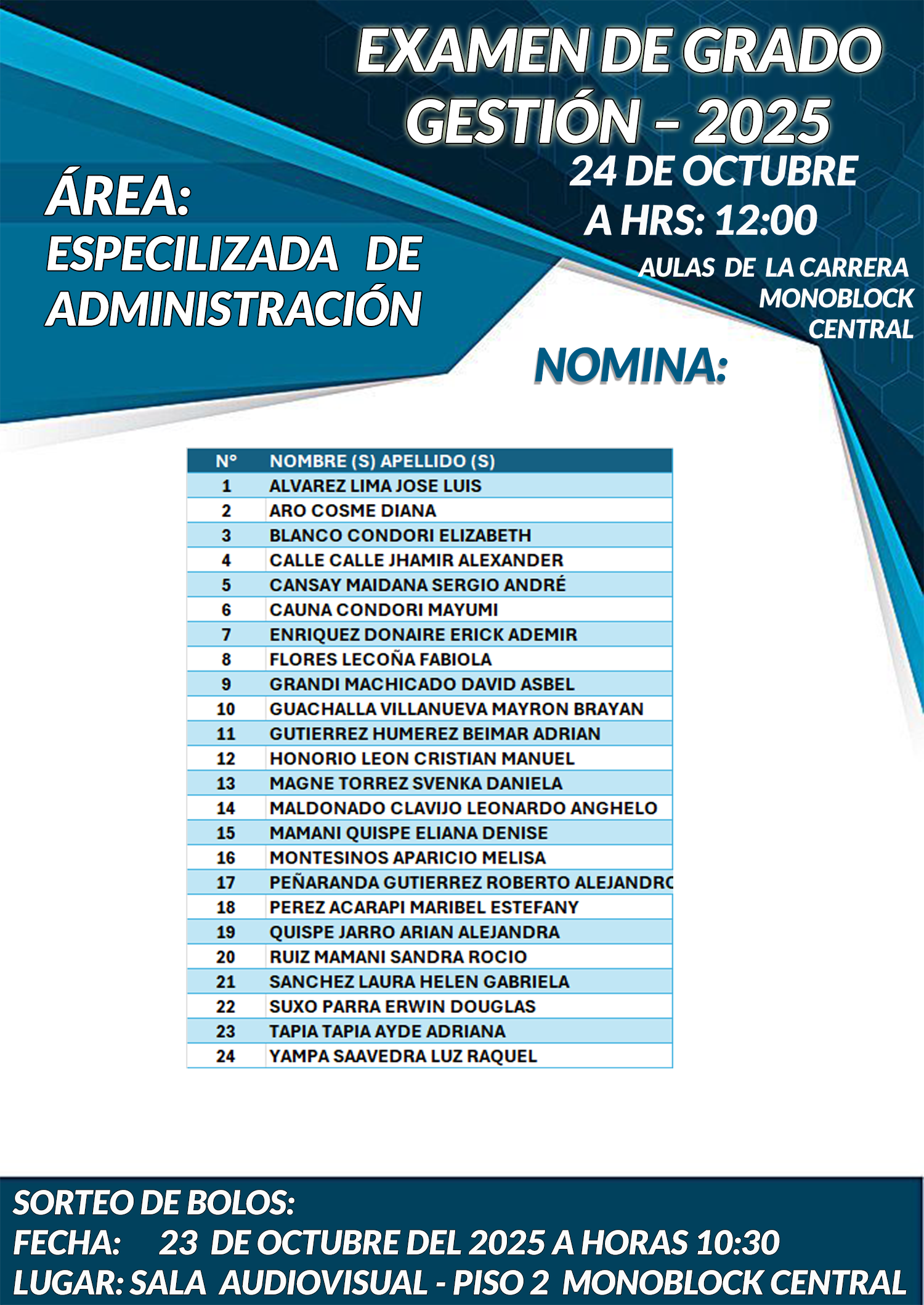 IMPORTANTE NOTICIAS SORTEO DE BOLOS – EXAMEN DE GRADO 24 DE OCTUBRE DEL 2025 *ÁREA: ESPECILIZADA DE ADMINISTRACIÓN