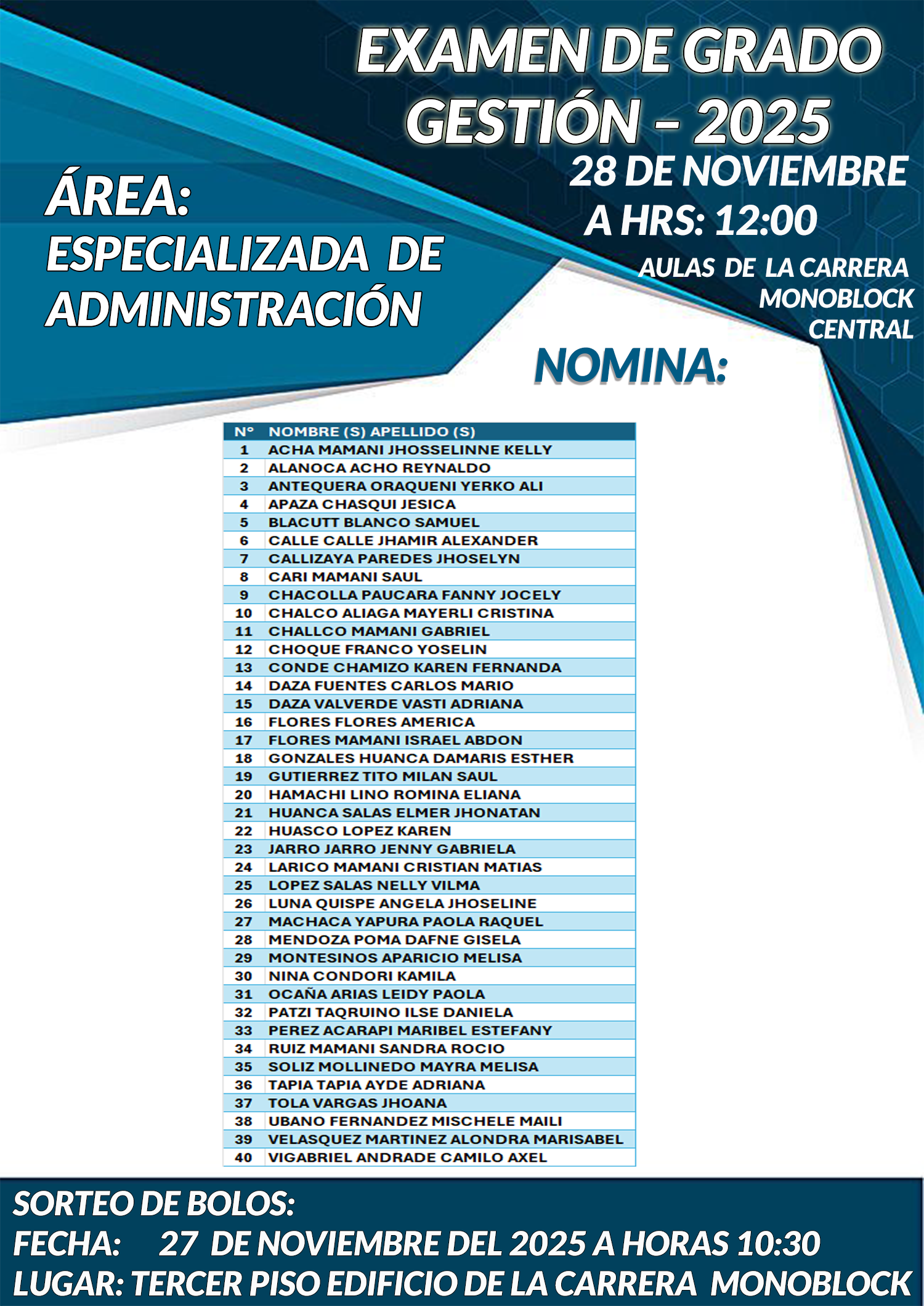 IMPORTANTE NOTICIAS SORTEO DE BOLOS – EXAMEN DE GRADO 28 DE NOVIEMBRE DEL 2025 *ÁREA: ESPECIALIZADA DE ADMINISTRACIÓN