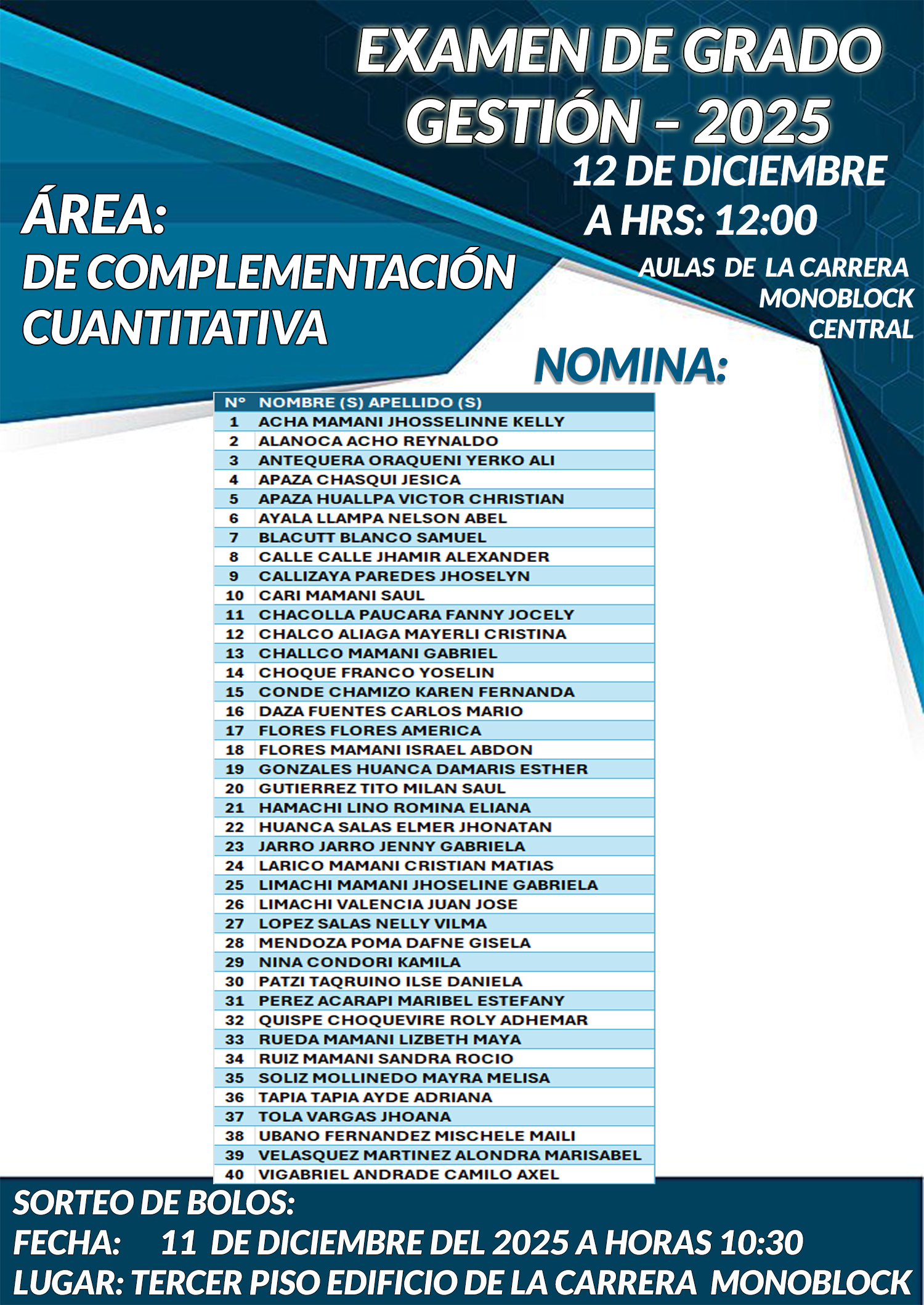 IMPORTANTE NOTICIAS SORTEO DE BOLOS – EXAMEN DE GRADO 31 DE OCTUBRE DEL 2025 *ÁREA: DE COMPLMENTACIÓN CUANTITATIVA