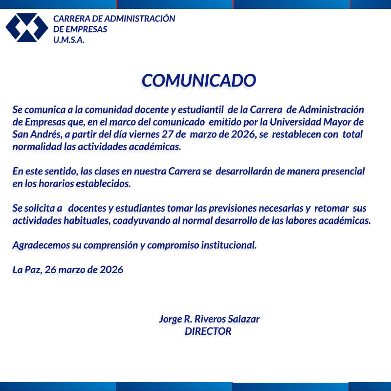 Carrera de Administración de Empresas – UMSALa Carrera de Administración de Empresas invita a sus estudiantes a participar del curso…